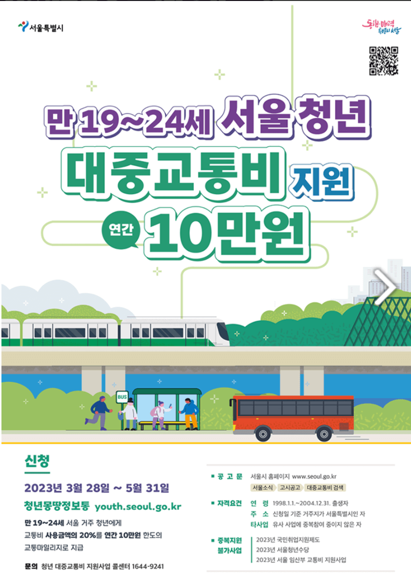 서울시는 만 19세에서 24세 서울시 거주 청년에게 경제적 부담 완화 및 이동권 보장을 위해 연간 10만 원의 교통비를 지원해 주는 사업을 발표했습니다. 신청기간 5월 27일까지이며 자격기준과 신청방법 자세히 소개해 드리겠습니다. 1분만 시간 내시어서 모두 교통비 지원받으시기 바랍니다. 바쁘신 분들을 위해 아래 링크에서 바로 확인해 보세요.