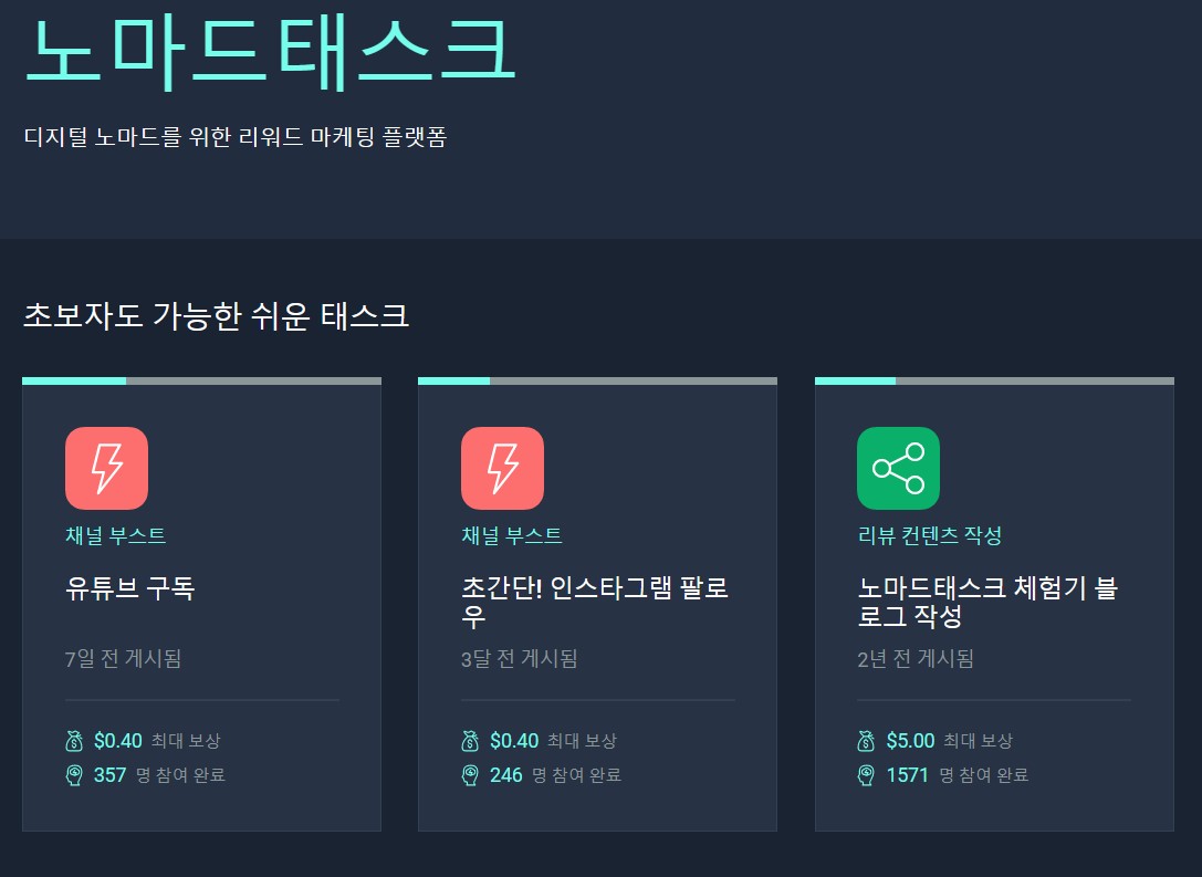 이 노마드태스트라는 사이트의 장점은 각 미션마다 가격이 다르며 개인이 선택하여 쉽고 어려운 미션을 선택하여 할 수 있다는 점입니다. 높은 가격대의 미션은 어렵고 복잡하지만 많은 보상금을 받을 수 있고 쉽고 간편할수록 미션이 금방 끝나며 여러 가지를 시도하여 보상을 받을 수 있습니다. 미션을 수행하면 72시간에 미션을 낸 사람이 직접 승인을 해주어야 하고 72시간이 지나면 자동으로 승인이 되어 보상을 받을 수 있습니다. 미션을 선택하면 몇 시간에 미션을 제출해야 하는지 어떤 미션을 수행하고 제출해야 하는지 꼼꼼히 확인을 한 후 제출해야 미션이 잘 수행할 수 있습니다. 각 미션마다 수행하는 방법과 제출물이 다르기 때문에 잘 살펴보고 참여하시면 얼마든지 많은 미션을 하실 수 있습니다.