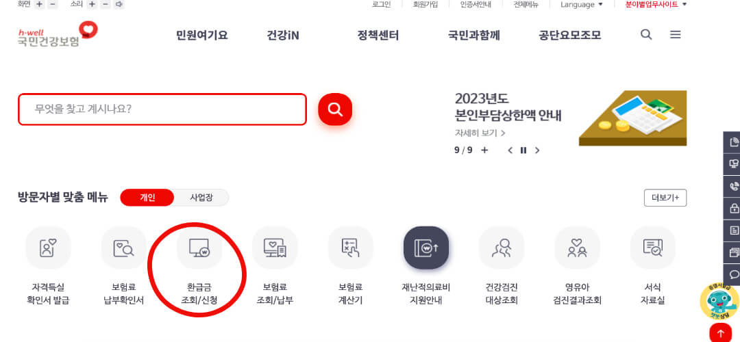 참고로 아래쪽에 '환급금(지원금)조회/신청' 메뉴에서는 연말정산 환급금 외에도 본인부담금 환급금 등 6가지 건강보험료 환급금을 조회해 보실 수 있으니깐 이번 기회에 다른 환급금은 없는지 한 번씩 확인해 보시는 것도 좋을 거 같습니다.